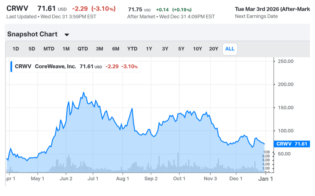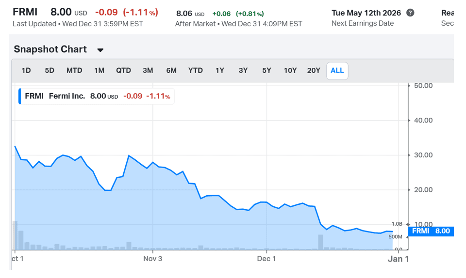An example of what happens when funding is in question is Fermi, a pre-revenue, energy and data center development company that had its IPO in October of 2025. Its stock is down 75% in just three months. It had an impressive 46% single-day drop after an “investment-grade” tenant (rumored to be Amazon) terminated a $150 million construction funding agreement.